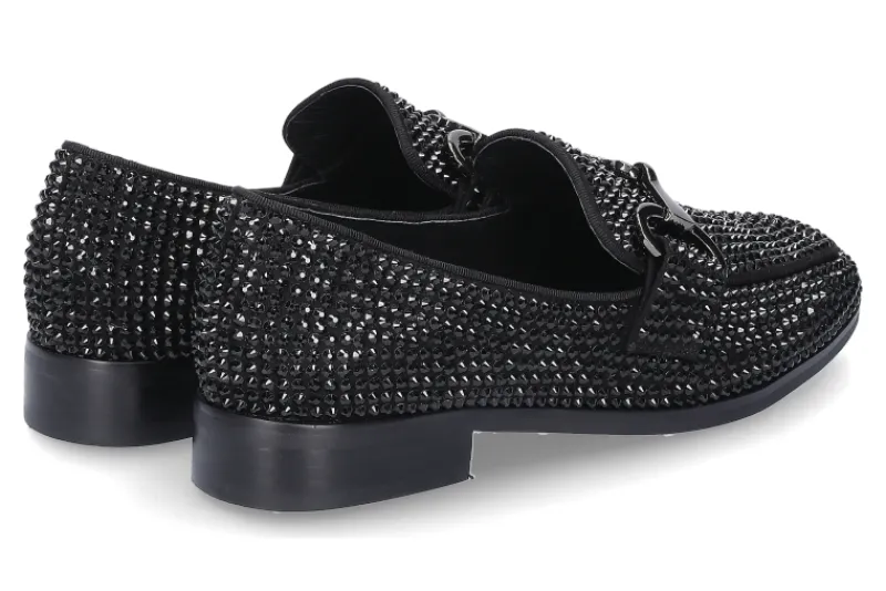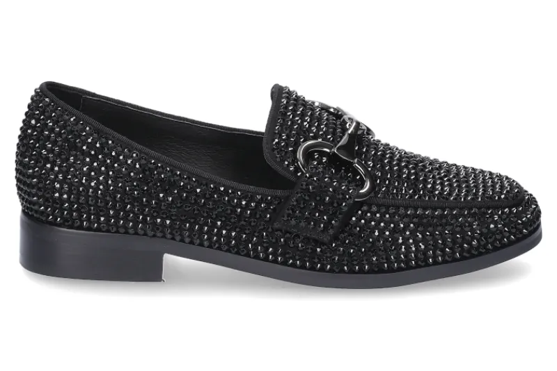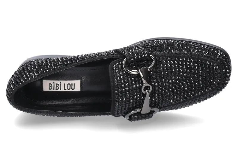 Der stylische Loafer NEGRO BLACK von Bibi Lou ist ein wahrer Blickfang. Das Modell wurde außen mit schwarzen Glitzersteinen besetzt. Das wunderschöne Funkeln der Steine wie auch die Schnalle sind ein absoluter Trend und lassen den Schuh sehr elegant wirken. Die Innensohle wie auch das Innenfutter wurden aus Leder gefertigt.