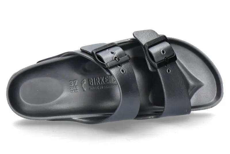 Die Birkenstock Damen-Pantolette ARIZONA EVA in Anthracite ist die perfekte Kombination aus Leichtigkeit, Funktionalität und Komfort. Gefertigt aus hochwertigem EVA-Material, ist sie besonders wasserfest, strapazierfähig und pflegeleicht – ideal für Strand, Pool oder Freizeit. Das anatomisch geformte Fußbett bietet den typischen Birkenstock-Tragekomfort und unterstützt die natürliche Fußstellung. Die schmale Weite sorgt für eine optimale Passform bei schlankeren Füßen. Die zwei verstellbaren Riemen ermöglichen eine individuelle Anpassung, während die flexible EVA-Sohle für Dämpfung und angenehmes Laufgefühl sorgt. Die elegante Anthracite-Farbe macht die Pantolette vielseitig kombinierbar. Ein leichter, bequemer Allrounder für den Sommer – perfekt für stilbewusste Frauen mit aktivem Lebensstil.