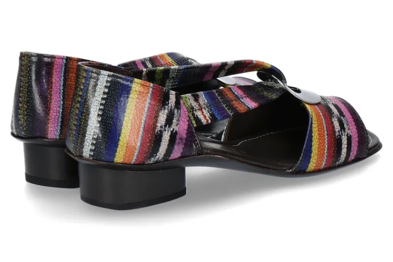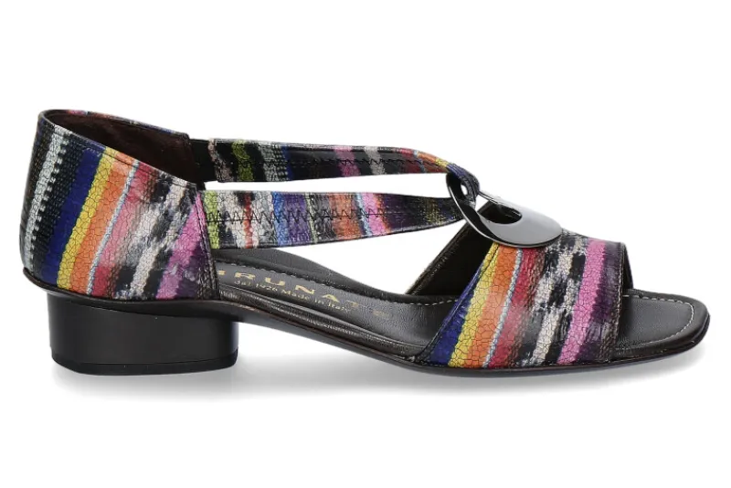 Die Brunate Sandale aus beducktem Lackleder ist durch die einmalige Farbkombination sehr gut kombinierbar. Die Sandale hat Stretcheinfassungen und passt sich deswegen sehr gut dem Fuss an. Das Innenfutter besteht aus Leder unt istz weich gepolstert. Die Sohle hat einen 25 mm Absatz und ist vollständig aus Leder. Handgefertigt in Italien ist die Brunate Sandale hervorragend verarbeitet. Ein Blickfang ist zudem die dazu passende Handtasche.