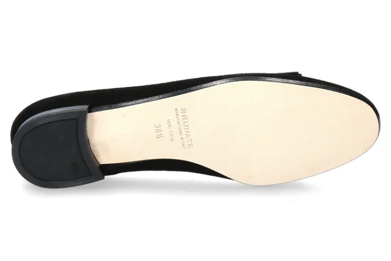 Der feine Slipper aus Veloursleder in Schwarz mit Ripsschleife ist edel und bequem. Das Modell verfügt über ein Lederinnenfutter sowie eine Ledersohle. Ein 15 mm gelackter Absatz vervollständigt den eleganten Look des Schuhs. Gefertigt werden Schuhe von Brunate zu 100 % in Italien.