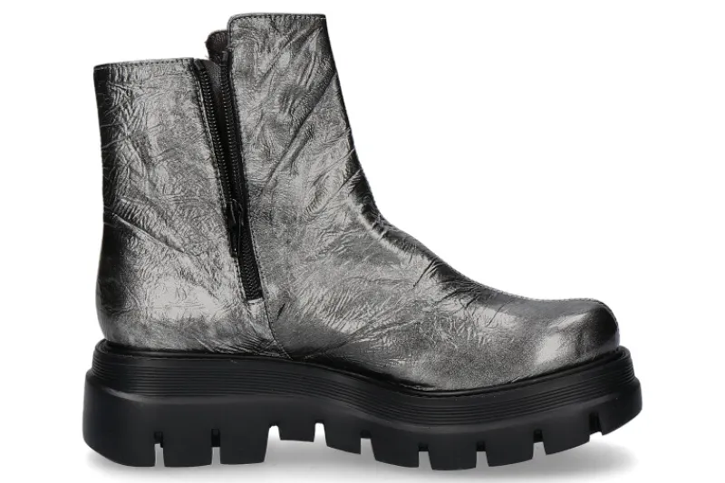 Der „EDO“ Damenschuh von Brunate begeistert durch das hochwertig verarbeitete Lackleder in silber. Öffnen lässt sich dieser bequem durch einen eingefassten Reißverschluss. Das Innenleben der Stiefelette besteht aus feinem Nappaleder. Für den exklusiven Look sorgt zudem die derbe Gummilaufsohle mit starkem Profil. Hergestellt werden Schuhe von Brunate mit viel Liebe zum Detail in Italien.