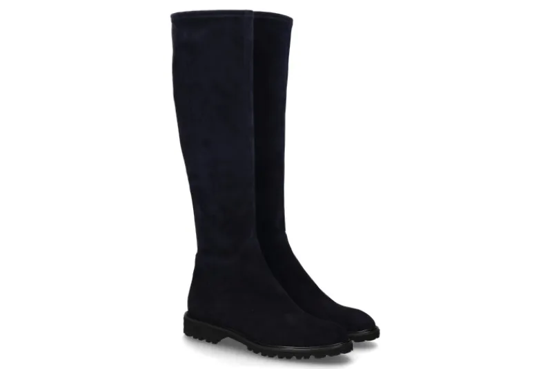 Der modische Stiefel mit Stretchschaft überzeugt mit einer schlichten, aber dennoch beeindruckenden Optik. Der Schuh ist aus dunkelblauem Veloursleder gefertigt. Die Laufsohle, mit extraleichtem Profil, sorgt für einen angenehmen Tragekomfort. Die Innensohle ist aus Leder. Hergestellt werden Brunate Schuhe in Italien.