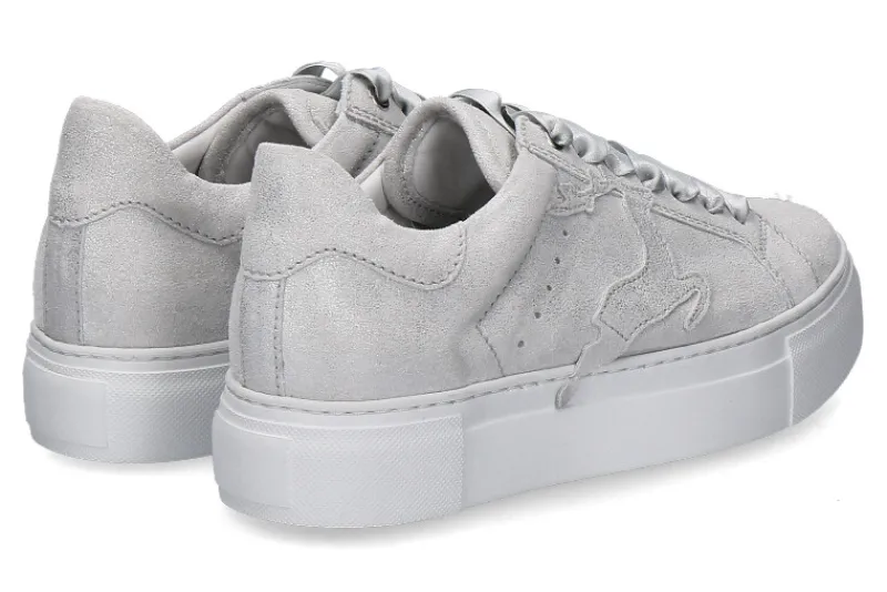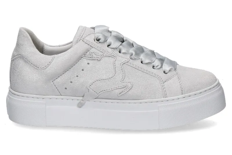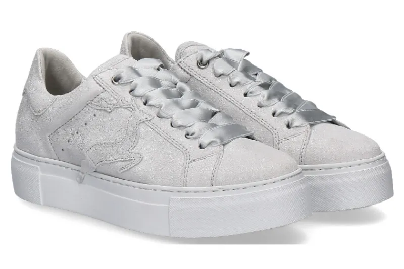 Der weiß/silberne Sneaker von dirndl + bua überzeugt mit tollen Details. Der Schuh aus Veloursleder ist innen mit Leder ausgefüttert. Die Decksohle ist ebenfalls aus Leder. Die Satin-Schnürsenkel machen den Sneaker zum absoluten Highlight. Nicht nur zur Tracht sondern auch im Alltag treffen sie mit diesem Modell die richtige Entscheidung. Der seitliche Hirsch macht den Schuh zum Blickfang. Bestens werden die Schuhe in Italien gefertigt.