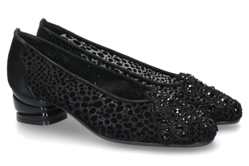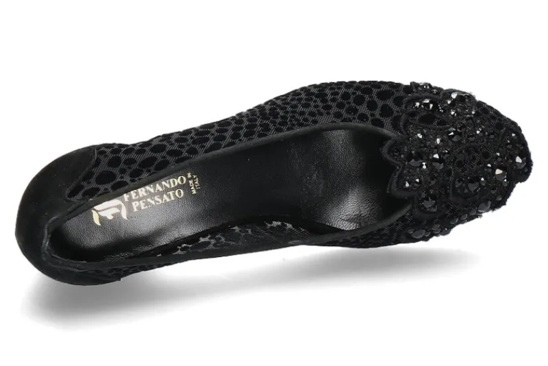 Fernando Pensato Pumps in schwarz mit schwarzen Swarovski Strasssteinen, Mesh Material, Handmade in Italy, Ledersohle mit halber Gummisohle, Passende Tasche erhältlich, 35 mm Absatz.