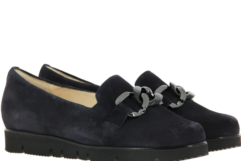 Der modische Slipper von Hassia in einem schönen Nachtblau ist mit einem VARIO Fußbett ausgestattet, das auch variabel herausnehmbar ist. Die Innensohle ist aus Kalbsleder. Das Obermaterial aus Veloursleder ziert ein Kettendetail in Schwarz. Die Schuhe werden in Österreich hergestellt.