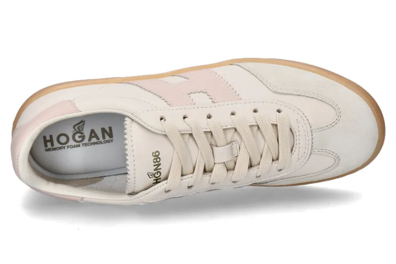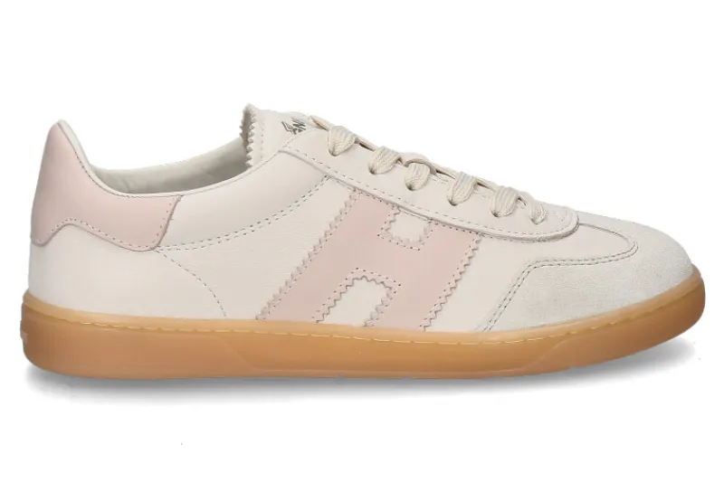 Der Hogan Damen-Sneaker COOL ALLACCIATO in Beige/Rosa kombiniert edles Glattleder mit stilvollen Velourslederdetails und sorgt für eine luxuriöse Optik. Das Innenfutter aus Leder und Frottee bietet höchsten Tragekomfort und ein angenehmes Fußklima. Die wechselbare Textilsohle ermöglicht individuelle Anpassung und zusätzlichen Komfort. Mit einer 25 mm hohen Gummilaufsohle bietet der Sneaker eine dezente Erhöhung und optimale Dämpfung. Sein sanfter Farbmix aus Beige und Rosa verleiht ihm eine feminine Note und macht ihn zum perfekten Begleiter für moderne, stilbewusste Frauen. Vielseitig kombinierbar, passt er sowohl zu lässigen als auch eleganteren Looks. Ein zeitloser Schuh mit sportlicher Eleganz.