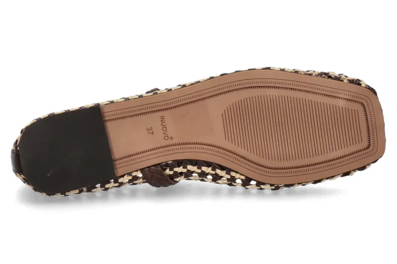 Die Inuovo Ballerina GOAT in der Farbe Chocolate vereint stilvolles Design mit hohem Tragekomfort. Das geflochtene, offene Leder verleiht dem Schuh eine sommerliche Leichtigkeit und zugleich eine elegante Note. Ein verstellbarer Riemen um den Rist sorgt für optimalen Halt und individuelle Passform. Die Lederdecksohle und das hochwertige Lederfutter garantieren angenehmen Tragekomfort auch an warmen Tagen. Die karreeförmige Schuhspitze liegt voll im Trend und verleiht dem Modell einen modernen Touch. Diese Ballerina ist ideal für modebewusste Frauen, die Wert auf Qualität, Stil und Bequemlichkeit legen. Ob zu Jeans, Kleid oder Rock – der vielseitige Schuh lässt sich mühelos kombinieren und begleitet Sie stilvoll durch Alltag und Freizeit. Ein Must-have für den Sommer.