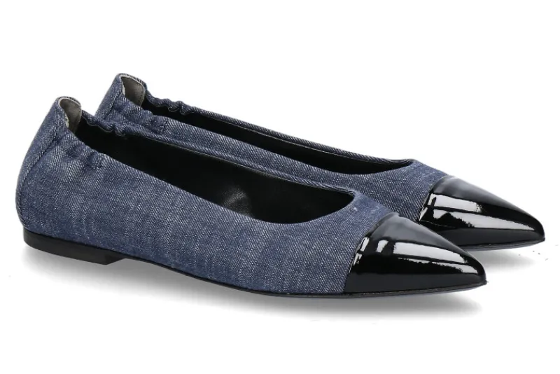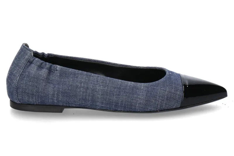 Der Kennel & Schmenger Ballerina GRETA präsentiert sich in einem auffälligen blauen Jeansstoff mit einer eleganten schwarzen Lackkappe, die dem Schuh eine moderne und raffinierte Note verleiht. Das spitze Modell betont die feminine Silhouette und setzt einen trendigen Akzent. Die Ledersohle gewährleistet einen bequemen Tragekomfort und sorgt für eine elegante Lauffläche. Das Lederinnenfutter schafft eine angenehme Umgebung für den Fuß, während die Lederinnensohle eine weiche Dämpfung bietet. Dieser Ballerina kombiniert geschickt Komfort mit stilvoller Ästhetik und eignet sich perfekt für Frauen, die modische Akzente setzen möchten. Die hochwertige Verarbeitung und die harmonische Farbkombination machen ihn zu einem vielseitigen Begleiter für verschiedenste Anlässe.