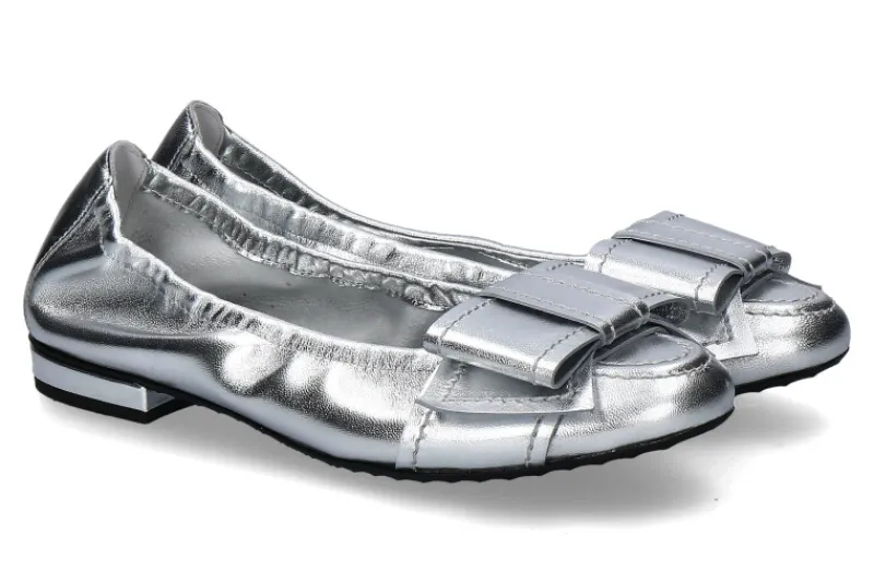 Der Kennel & Schmenger Ballerina präsentiert sich in strahlendem silbernen Nappaleder und beeindruckt mit einer auffälligen, großen Lederschleife, die dem Schuh einen femininen und zugleich modernen Look verleiht. Ein seitlich eingefasster Gummizug gewährleistet eine bequeme Passform und erleichtert das An- und Ausziehen. Die griffige Gummisohle sorgt für einen sicheren Tritt und macht den Ballerina alltagstauglich. Die hochwertige Verarbeitung zeigt sich auch in der Lederinnensohle, die zusätzlichen Komfort bietet. Dieser Ballerina von Kennel & Schmenger vereint stilvolles Design mit praktischen Eigenschaften, was ihn zu einer perfekten Wahl für Damen macht, die Eleganz und Bequemlichkeit schätzen.