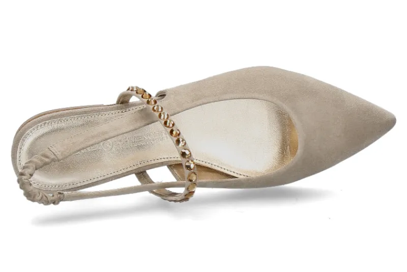 Der Kennel & Schmenger Sling-Ballerina GRETA SUEDE in Linen/Beige verbindet feminine Eleganz mit hochwertigem Komfort. Das edle Veloursleder verleiht dem Schuh eine luxuriöse Optik, während die spitze Schuhkappe für eine elegante, moderne Silhouette sorgt. Ein besonderer Blickfang sind die dekorativen Steine am Riemen, die dem Design eine stilvolle Note verleihen. Der Gummizug am Fersenriemen sorgt für eine optimale Passform und angenehmen Halt. Die Leder-Deck- und Laufsohle unterstreichen die hochwertige Verarbeitung und garantieren ein komfortables Tragegefühl. Perfekt für schicke Alltagslooks oder besondere Anlässe – dieser Sling-Ballerina ist ein echtes Must-have für stilbewusste Frauen!