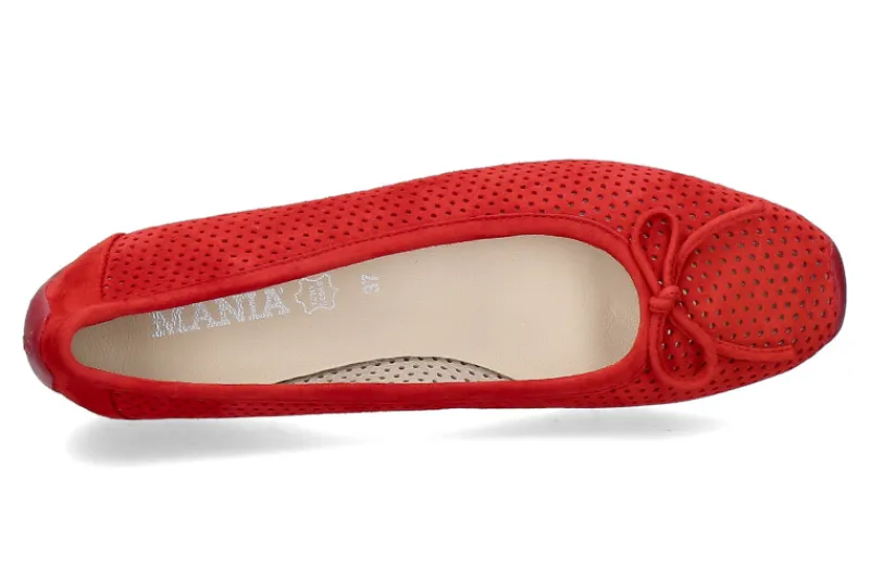 Der Ballerina von Mania in rot wurde aus weichem Veloursleder gefertigt. Durch die Perforierung ist der Ballerina der ideale Begleiter für den Sommer. Besten Tragekomfort verspricht die weiche helle Fütterung aus Leder sowie die Ledersohle. Eine Schleife ziert den Ballerina. Die Laufsohle aus Gummi verspricht einen rutschfesten Halt. Besten hergestellt werden Mania in Italien.