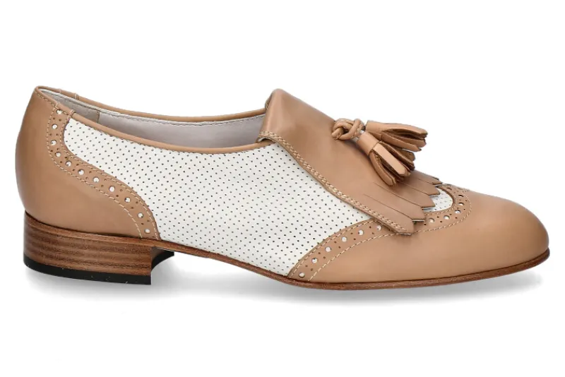 Der Maretto Slipper in braun-weiss aus perforiertem Leder ist zu vielen Anlässen der ideale Kombinationspartner. Vollendet wird das Design mit dem Kamm und den zwei Quasten. Hoher Tragekomfort verspricht die Innenfütterung aus feinstem Leder. Die Laufsohle wurde ebenfalls aus Leder gefertigt. MADE IN ITALY!