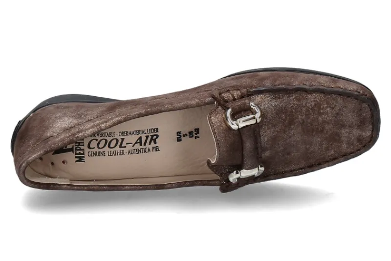 Der Mephisto Damen-Slipper aus hochwertigem Leder in bronze ist ein bequemer Allrounder und perfekt zu jedem Outfit und Anlass. Die glänzende Schließe auf der Vorderkappe rundet das Design elegant und trendig ab. Ausgestattet ist das Modell zudem mit einer weichen Lederfütterung und einer antik shock Gummilaufsohle. Hergestellt werden Mephisto Schuhe zu 100% in Frankreich.