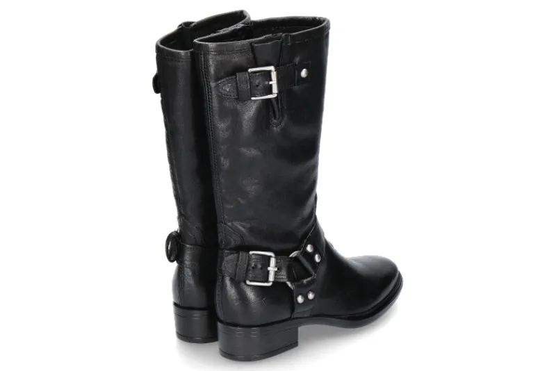 Die Mjus Stiefel aus schwarzem Leder bieten eine perfekte Kombination aus Stil und Komfort. Sie sind mit einer Textilfütterung ausgestattet, die für angenehme Wärme und Tragekomfort sorgt. Die Gummilaufsohle gewährleistet eine gute Griffigkeit und Langlebigkeit. Ein seitlicher Reißverschluss erleichtert das An- und Ausziehen der Stiefel. Die dekorativen Schnallenapplikationen verleihen den Stiefeln eine besondere Note und betonen das edle Design. Mit einem 3,5 cm hohen Blockabsatz bieten diese Stiefel eine angenehme Höhe und Stabilität. Sie sind vielseitig kombinierbar und ideal für verschiedene Anlässe, von alltäglichen Unternehmungen bis hin zu besonderen Gelegenheiten. Perfekt für modebewusste Frauen, die Qualität und Stil schätzen. Die Schafthöhe beträgt 27,5 cm bei Schuhgröße 37.