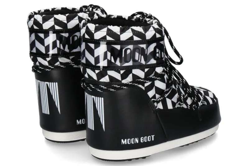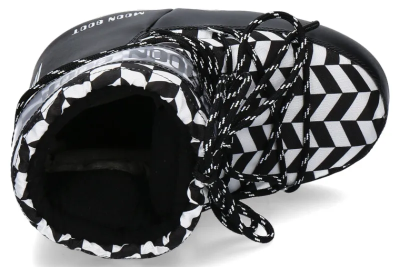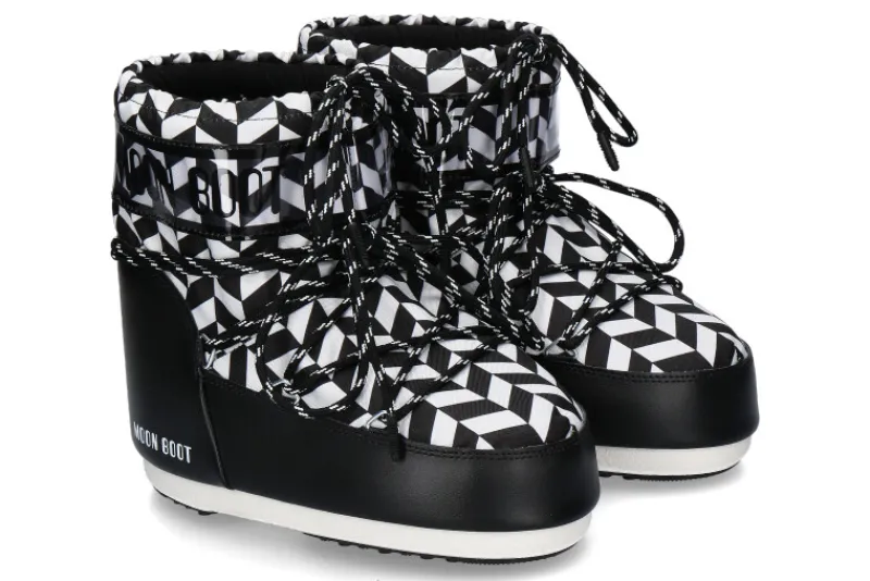 Der Moon Boot ICON LOW OPTICAL Bootie in Schwarz-Weiß besticht durch ein auffälliges geometrisches Muster, das einen einzigartigen, modernen Look erzeugt. Das Design ist beidseitig tragbar und damit vielseitig kombinierbar. Das Material ist 100 % wasserabweisend, ideal für nasse Wetterbedingungen.