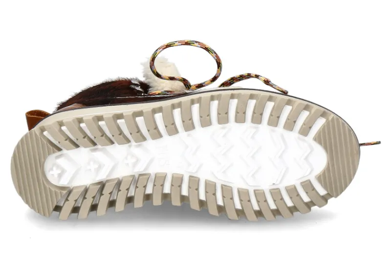 Die New Italia Shoes Boots ERIKA sind stilvolle, wintertaugliche Stiefel aus hochwertigem Rindsleder in Braun und Weiß, veredelt mit Rindshaar-Details für eine besondere Optik. Am Obermaterial setzen weiche Lammfell-Details zusätzliche Akzente, die nicht nur modisch, sondern auch wärmend sind. Die Schnürsenkel werden durch robuste, silberne Ösen geführt, während braune Glattlederdetails dem Design eine edle Note verleihen. Die sportive, profilierte Gummisohle bietet optimalen Halt auf verschiedenen Untergründen, ideal für winterliche Bedingungen. Innen sind die Boots mit einer Kombination aus wärmendem Webpelz, Lammfell und Schurwolle gefüttert, was für angenehmen Tragekomfort und hervorragende Isolation sorgt. Diese Boots vereinen Funktionalität und modischen Anspruch perfekt.
