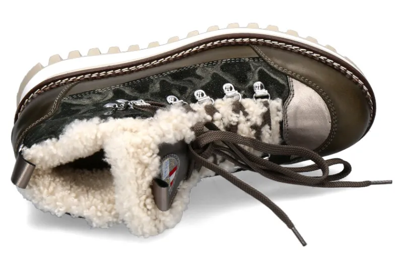 Die NiS New Italia Shoes Boots mit Keilsohle sind ein eindrucksvolles Modestatement, das Stil und Komfort vereint. Hergestellt aus dunkelgrünem Leder und bedrucktem Veloursleder, bieten sie einen einzigartigen Look. Die Zunge aus gelocktem Lammfell verleiht diesen Stiefeln eine luxuriöse Note und hält Ihre Füße warm und gemütlich. Das Innenfutter aus Lammfell und Webpelz bietet zusätzliche Isolierung und Komfort, ideal für kalte Wintertage. Die Sohle in hellem Beige und Weiß mit Profil verleiht nicht nur eine moderne Ästhetik, sondern auch eine rutschfeste Traktion. Diese Boots sind perfekt für diejenigen, die Mode und Funktionalität schätzen. Sie sind vielseitig genug, um sowohl mit lässigen als auch mit schickeren Outfits getragen zu werden. Die Kombination aus hochwertigen Materialien und durchdachtem Design macht sie zu einem unverzichtbaren Teil Ihrer Schuhkollektion.
