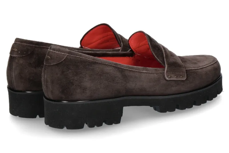 Der klassische Slipper MARTA der Marke Pas de rouge begeistert in dunkelbraun aus Veloursleder der ideal kombinierbar ist. Das Innenfutter ist wie gewohnt aus rotem Leder ausgekleidet und zusätzlich weich abgepolstert. Die aufgeschäumte, profilierte Laufsohle aus Gummi ist sehr leicht, flexibel und rutschfest. Handgefertigt werden Pas de rouge Schuhe mit einer sehr guten Verarbeitung in Italien.