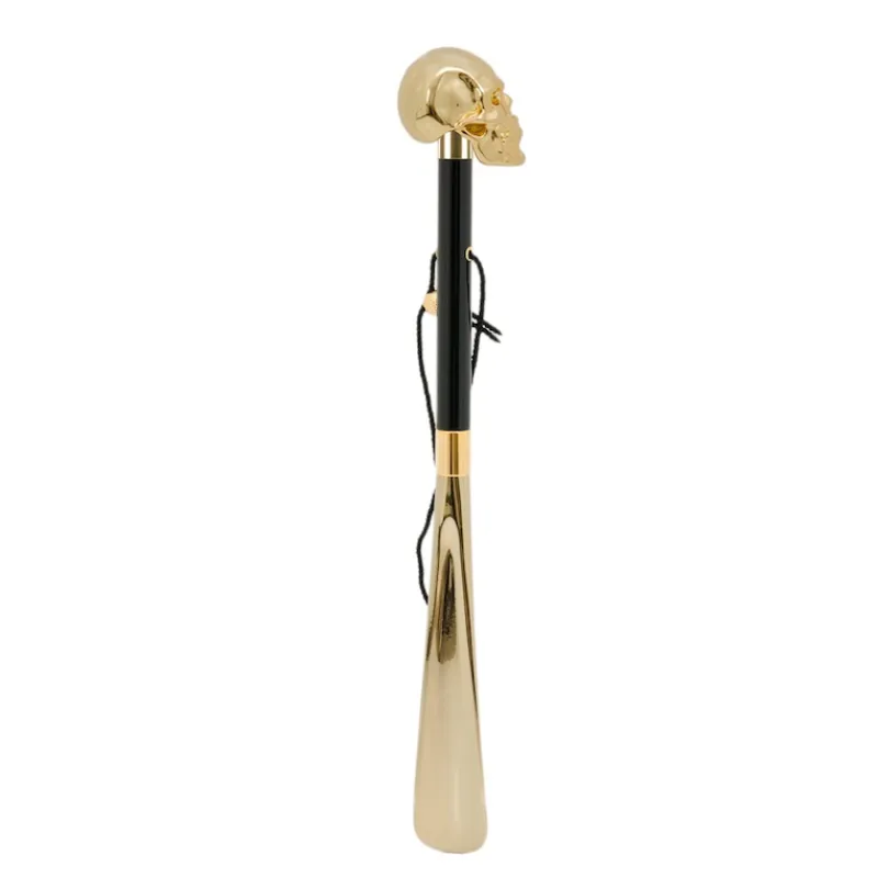 Ein Schuhanzieher mit Whow- Effekt! Dieser hochwertige Schuhlöffel von Pasotti ist zu 100% in Italien gefertigt und überzeugt durch beste Verarbeitung bis ins kleinste Detail. Der Schuhanzieher besteht aus schwarz lackiertem Buchenholz und ABS Kunststoff, welches sehr flexibel und widerstandsfähig ist. Abgerundet wird das edle Stück durch den goldenen Totenkopf, der aus Harz besteht. Auch als Geschenk eine sehr gute Wahl!