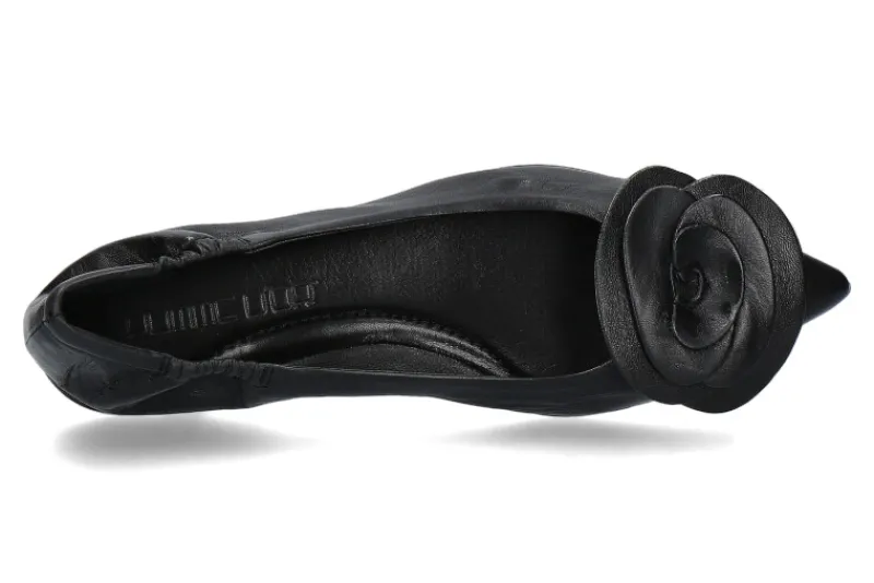 Die Pomme d’Or Ballerina INGRID in klassischem schwarz vereint zeitlose Eleganz und hohen Tragekomfort. Mit einer spitz zulaufenden Schuhkappe bietet sie ein modernes Design, das durch eine zarte Rosenapplikation aus Leder auf der Vorderkappe akzentuiert wird. Das hochwertige Lederfutter sorgt für ein angenehmes Fußklima, während die Lederlaufsohle mit einem kleinen Gummianteil für zusätzliche Flexibilität und Rutschfestigkeit sorgt. Diese Ballerina ist die perfekte Wahl für besondere Anlässe oder stilvolle Alltagslooks, da sie sowohl bequem als auch ästhetisch ansprechend ist. Dank der edlen Materialien und präzisen Verarbeitung bietet sie eine gelungene Kombination aus Funktionalität und Design, die jedem Outfit einen Hauch von Luxus verleiht.