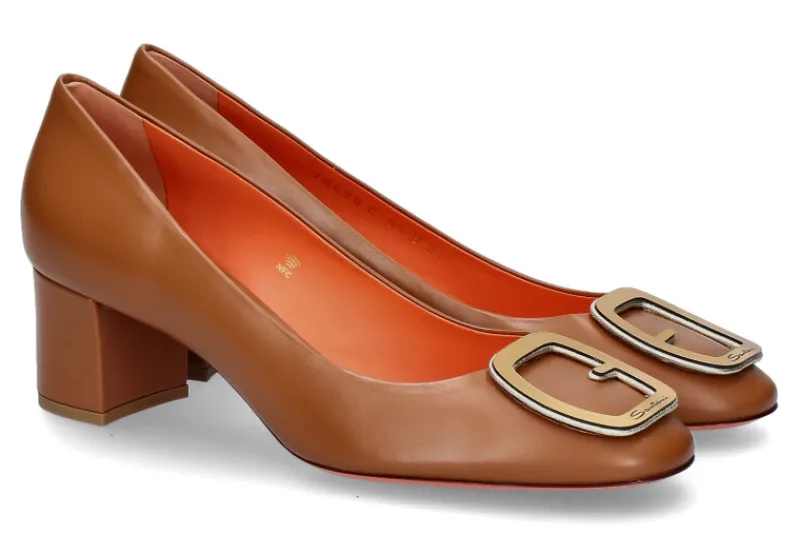 Die Pumps von Santoni, gefertigt aus zartem hellbraunem Leder, präsentieren sich mit einem 50 mm Blockabsatz, der elegant mit Leder überzogen ist. Die runde Form verleiht dem Schuh zeitlose Eleganz. Eine goldene Applikation auf der Vorderseite setzt glamouröse Akzente. Die Ledersohle mit einem geschickt platzierten Gummieinsatz gewährleistet Traktion und Komfort. Ein markantes orangefarbenes Innenfutter verleiht dem Schuh einen Hauch von Überraschung und Raffinesse. Jedes Detail zeugt von herausragender Handwerkskunst, da die Pumps vollständig in Italien handgefertigt wurden. Dieses meisterhaft gestaltete Schuhwerk verkörpert die Essenz italienischer Eleganz und Stil und ist eine Hommage an die Kunstfertigkeit der Handarbeit.