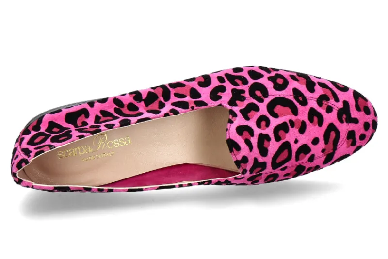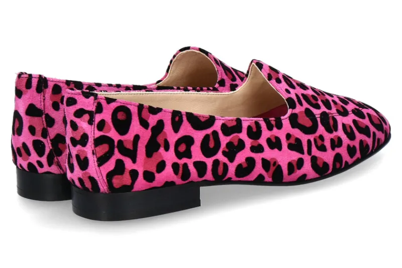 Das pinkfarbene Veloursleder mit dem Leo-Print verleiht den Slippern einen auffälligen und trendigen Look, der für Aufsehen sorgt. Der Schuh hat eine schlanke Silhouette und eine runde Schuhkappe, die den Fuß auf elegante Weise umhüllt.