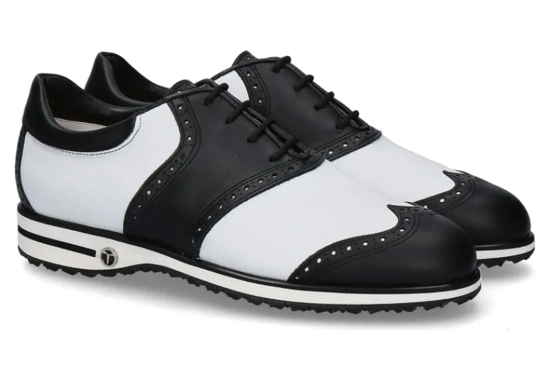 Der Damen Golfschuh SUSY VITELLO NERO BIANCO WATERPROOF von Tee Golf Shoes vereint Funktionalität und Stil in einem eleganten Design. Hergestellt aus hochwertigem schwarzen und weißen Kalbsleder, strahlt er zeitlose Eleganz aus. Das weiche imprägnierte Leder bietet Komfort und Flexibilität beim Golfspiel, während die strapazierfähige Sohle eine optimale Traktion auf dem Rasen gewährleistet. Die perfekte Passform sorgt für Stabilität und Unterstützung während des Schwungs. Mit seinem klassischen Farbschema lässt sich dieser Golfschuh mühelos mit verschiedenen Outfits kombinieren und verleiht der Golferin einen stilvollen Auftritt auf dem Platz. Egal, ob auf dem Grün oder beim gesellschaftlichen Zusammensein danach, dieser Damen Golfschuh von Tee Golf Shoes ist ein Must-Have für alle Golfbegeisterten, die Wert auf Qualität und Ästhetik legen. Hergestellt werden die Golfschuhe von Tee Golf Shoes in Italien.