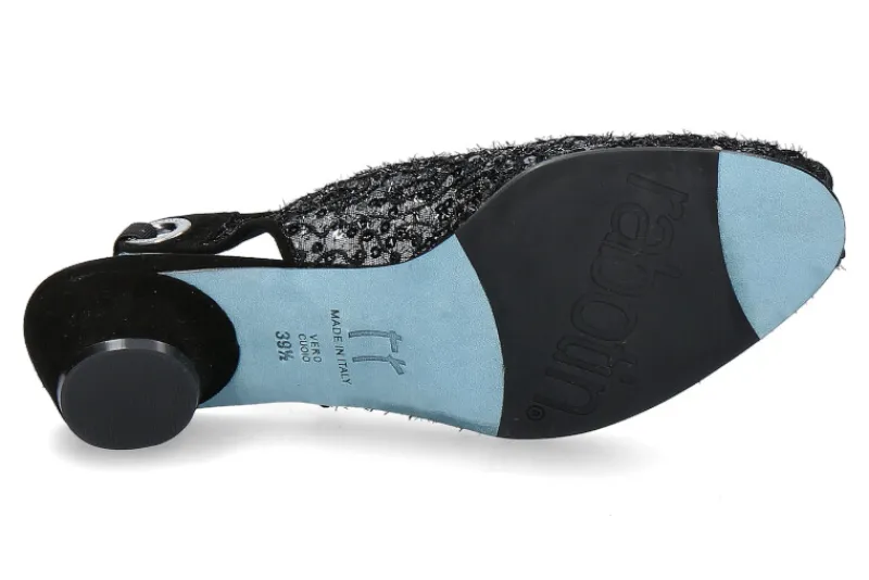 Exklusiv und elegant präsentiert sich die Sandale FIORE aus dem Hause Thierry Rabotin. Glitzernde Pailletten schmücken das Obermaterial aus Gaze, welches den Schuh zusätzliche Eleganz und Esprit beschehrt. Durch einen Elastikeinsatz an der Ferse schmiegt sich die Sandale wunderbar dem Fuss an. Zwei grosse Silberösen werten den Schuh zusätzlich auf. Der feine mit schwarzem Veloursleder überzogene 35 mm Absatz verleiht dem Open-Toe eine angenehme Laufhöhe. Die für Thierry Rabotin typische blaue Ledersohle ist mit einem Gummieinsatz versehen. Handgefertigt werden Schuhe der Marke Thierry Rabotin zu 100% in Italien.