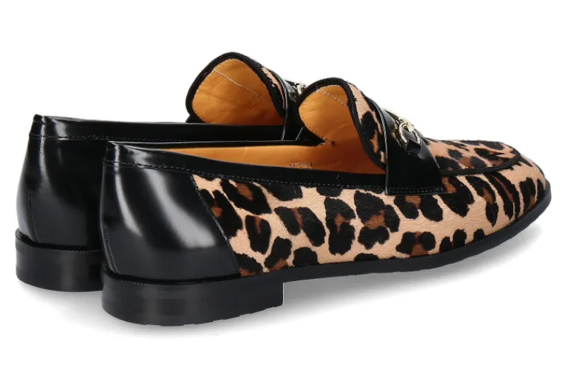 Der Truman’s Slipper kombiniert luxuriöses Design mit höchstem Komfort. Hergestellt aus edlem Ponyfell im auffälligen Leopardenmuster, verleiht er jedem Outfit eine elegante und zugleich wilde Note. Schwarze Glattlederdetails setzen stilvolle Akzente und unterstreichen das exklusive Erscheinungsbild. Eine dekorative Spange auf der Vorderkappe verleiht dem Slipper einen zusätzlichen Hauch von Raffinesse. Das weich gepolsterte Lederfußbett sorgt für außergewöhnlichen Tragekomfort, während die schwarze Gummilaufsohle sicheren Halt und Flexibilität bietet. Dieser Slipper ist die perfekte Wahl für modebewusste Frauen, die Stil und Komfort in einem Schuh vereinen möchten.
