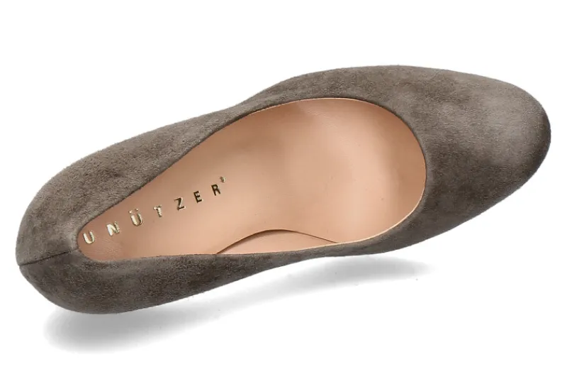 Elegant sowie schlicht zeigt sich dieser khaki Pumps aus feinem Veloursleder von Unützer. Durch seine klare Linie passt der chice Pumps zu festlichen Anlässen gleichermaßen wie zu Office Outfits. Ausgestattet mit hochwertiger Lederlaufsohle und feinem, hellen Innenfutter aus Leder ist der Pumps angenehm zu tragen. Bestens verarbeitet wurde der klassische Unützer in Italien.