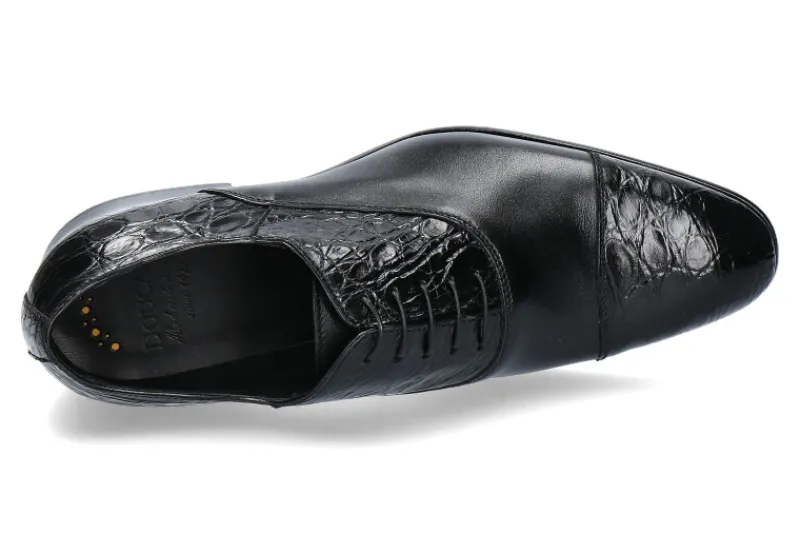 Der Doucal’s Schnürschuh in schwarz aus feinstem Glattleder und Krokodilsleder überzeugt durch seine perfekte Passform und dem zeitlosen Design. Innen begeistert das Modell aus feinstem Leder. Die Laufsohle wurde ebenfalls aus Leder gefertigt. Handgefertigt in Italien wurde der Doucal’s Herrenschnürschuh mit exzellenter Verarbeitung.