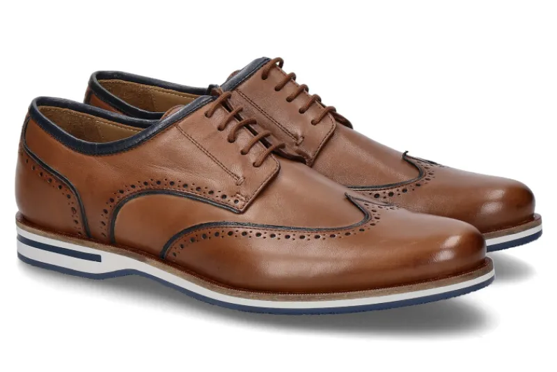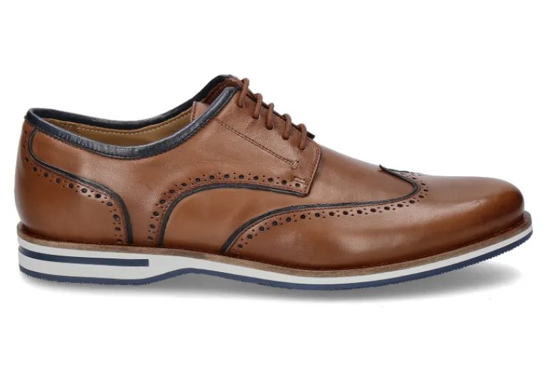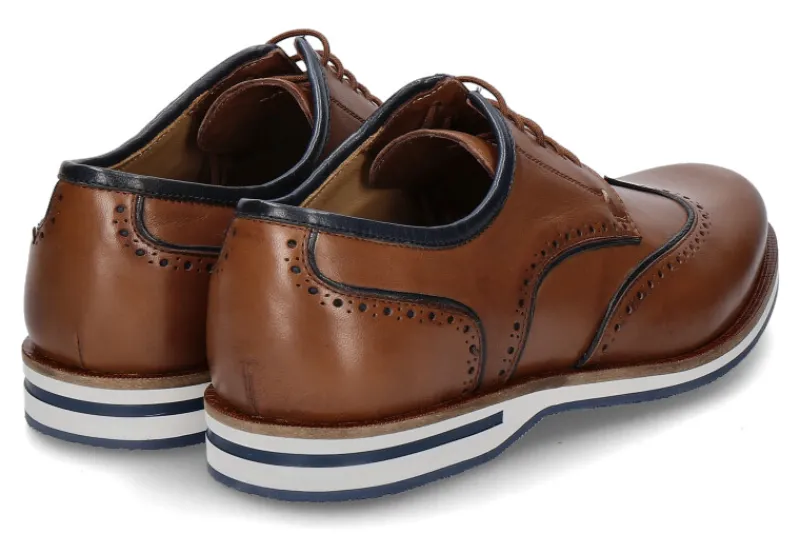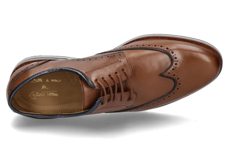 Der edle Herrenschnürer von Galizio Torresi ist ein klassischer Business-Schuh, kann aber durch seine trendigen Details wunderbar zu Alltagslooks kombiniert werden. Der Schuh ist aus hochwertigem braunen Leder gefertigt. Die Lyralochmusterung sowie marineblaue Farbdetails runden den schönen Schuh ab. Das Innere des Schuh ist mit braunem Leder ausgekleidet. Ein weiterer Hingucker ist die Sohle des Schuhs. Sie ist weiß mit marineblauen Streifen versehen. Sehr gute Passform und beste Verarbeitung zeichnen Galizio Toressi Schuhe aus. MADE IN ITALY!