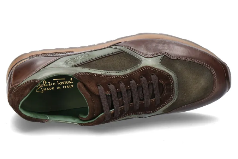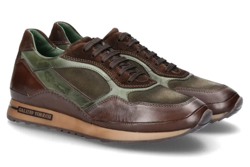Der Sneaker überzeugt mit einem Mix aus Glatt-und Veloursleder. Die Schuhe sind in warmen braun- und Grüntönen, die sich in der kommenden Saison einfach kombinieren lassen. Die Innenfütterung ist aus Leder. Außen an der Sohle ist das Markenlabel ersichtlich. Die Schuhe von Galizio Torresi werden in Italien gefertigt.