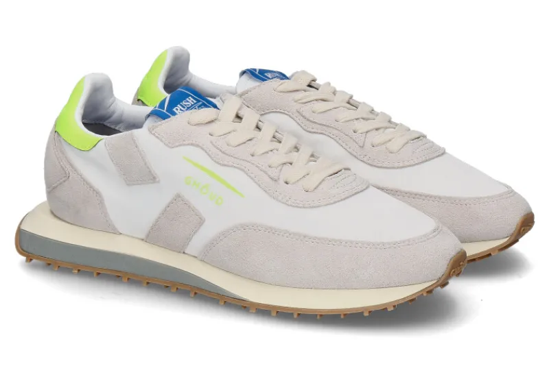 Der Ghoud Herren-Sneaker RUSH_C NYLON SUEDE in Weiß/Elephant überzeugt durch eine sportlich-elegante Optik und hochwertigen Materialmix. Gefertigt aus strapazierfähigem Nylon und weichem Veloursleder, kombiniert er Langlebigkeit mit modernem Design. Die herausnehmbare Textilsohle bietet individuellen Komfort und ermöglicht eine einfache Anpassung, ideal für vielseitige Einsätze.