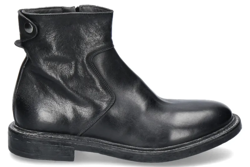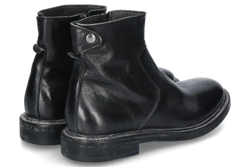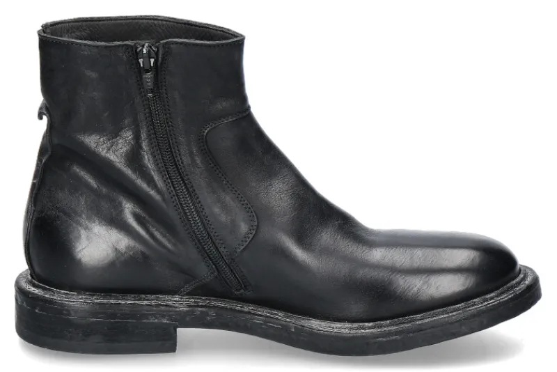 Die Moma Herren-Stiefelette MINSK CUSNA in Nero/Schwarz kombiniert zeitloses Design mit hochwertiger Handwerkskunst. Der seitliche Reißverschluss sorgt für einfaches An- und Ausziehen, während das edle Lederobermaterial und die Lederfütterung innen für hohen Tragekomfort und Atmungsaktivität sorgen. Die robuste Gummisohle bietet ausgezeichnete Griffigkeit und Haltbarkeit, wodurch die Stiefelette auch für längeres Tragen geeignet ist. Diese elegante und zugleich funktionale Stiefelette passt perfekt zu smarten und lässigen Outfits und eignet sich sowohl für den Alltag als auch für besondere Anlässe. Die Kombination aus Leder und Gummi macht sie stilvoll, bequem und langlebig.