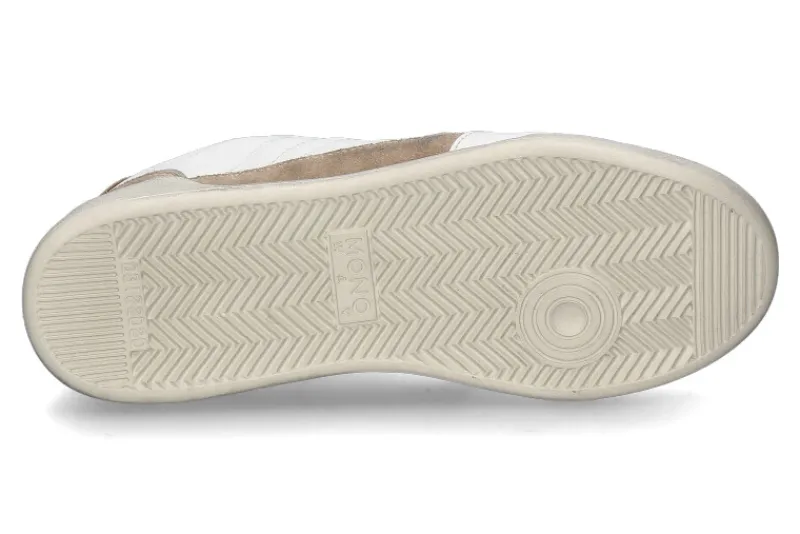 Der Herren-Sneaker von Monoway verbindet minimalistisches Design mit markanten Details und hohem Tragekomfort. Das weisse Leder verleiht dem Schuh eine zeitlose Eleganz, während die dunkelbraune Zunge und die braunen Schnürbänder stilvolle Kontraste setzen. Für mehr Individualität und Flexibilität liegen zusätzlich hellbeige Schnürbänder bei. Die hochwertige Verarbeitung zeigt sich auch im Innenleben: Leichte Materialien und eine gut gepolsterte Ausstattung sorgen für ein besonders angenehmes Tragegefühl – auch bei langem Einsatz. Die griffige Gummisohle bietet sicheren Halt und unterstützt einen stabilen Gang auf unterschiedlichsten Untergründen. Durch sein geringes Gewicht ist dieser Sneaker nicht nur optisch ein Highlight, sondern auch ideal für den täglichen Einsatz. Monoway steht für Stil, Komfort und urbane Lässigkeit.