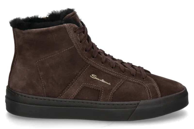 Der Santoni Herren-High-Top-Sneaker in Dunkelbraun aus Veloursleder vereint luxuriösen Stil mit höchstem Komfort. Dieser Sneaker ist mit einer warmen Lammfellfütterung ausgestattet, die ideal für kalte Tage ist. Ein praktischer Reißverschluss auf der Innenseite erleichtert das An- und Ausziehen, während die klassische Schnürung das Design abrundet und eine individuelle Passform ermöglicht. Die Gummilaufsohle sorgt für guten Halt und Strapazierfähigkeit, was den Schuh sowohl für den Alltag als auch für besondere Anlässe geeignet macht. Dieser High-Top-Sneaker ist perfekt für Herren, die Eleganz und Funktionalität in einem komfortablen Schuh schätzen.