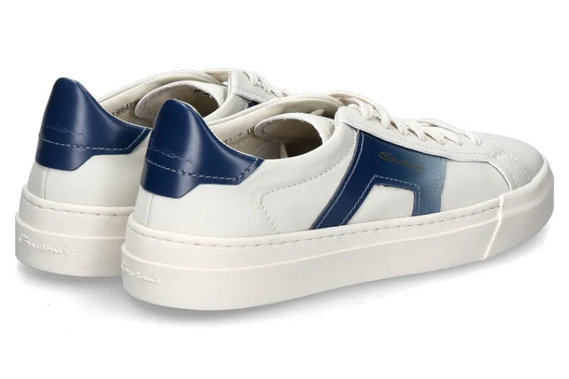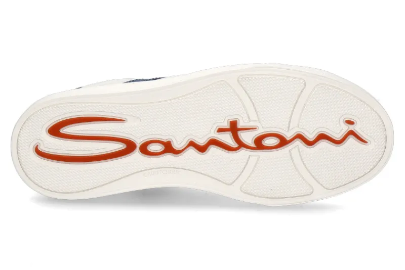 Die Santoni Herren-Sneaker in strahlendem Weißem Leder präsentieren sich als stilvolle Meisterwerke mit raffinierten Details. Die seitlichen Lederdetails in einem verlaufenden Blauton verleihen dem Schuh eine moderne und dynamische Ästhetik. Die Fersenkappe in Blau setzt einen markanten Akzent und verleiht dem Sneaker eine individuelle Note. Neben dem ästhetischen Design bietet der Schuh herausnehmbare Innensohlen für eine personalisierte Passform. Die Kautschuksohle sorgt nicht nur für eine zuverlässige Traktion, sondern auch für angenehme Dämpfung bei jedem Schritt. Dieses Modell verkörpert die Symbiose aus Eleganz und Funktionalität und ist die perfekte Wahl für Herren, die Wert auf stilvolles Auftreten und höchsten Komfort legen.